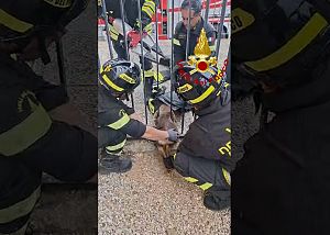 SCARLINO. Il cucciolo di circa un anno è precipitato per diversi metri in un punto a strapiombo sulla scogliera. E' stato soccorso dai vigili del fuoco